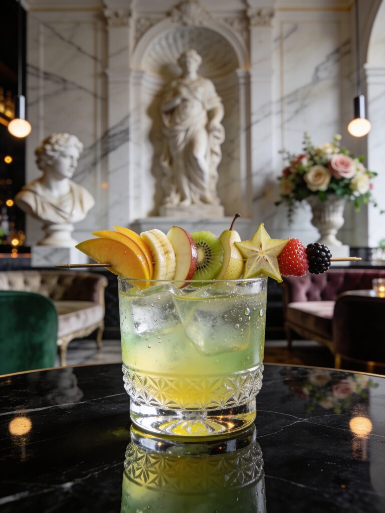 Fine Vodka, Chartreuse, Absinthe, lemon & sugar. Decorated with sugar and eight different fruits.