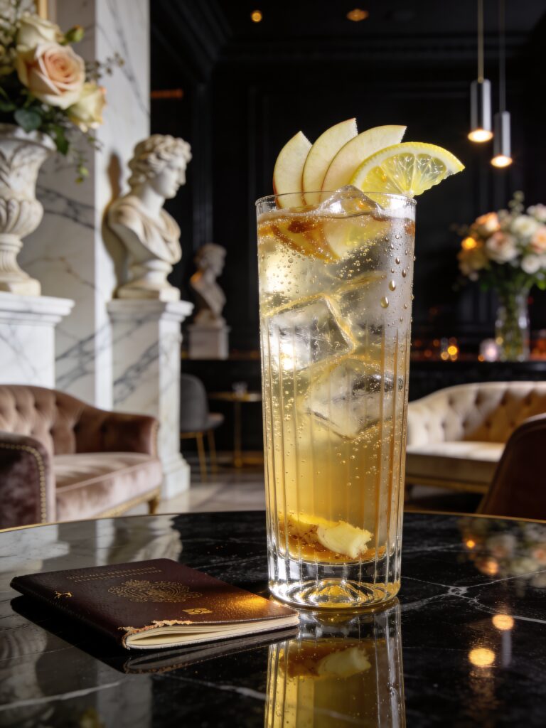 Fine Cognac, apple liqueur, pear liqueur, lemon, sugar & ginger ale. Decorated with apple & lemon.