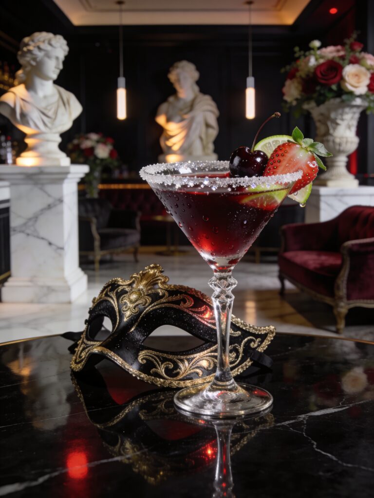 Garnish with cherries, strawberries, and a lightly sugared rim.
