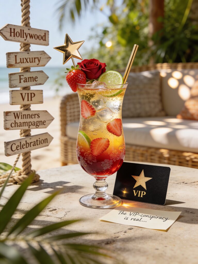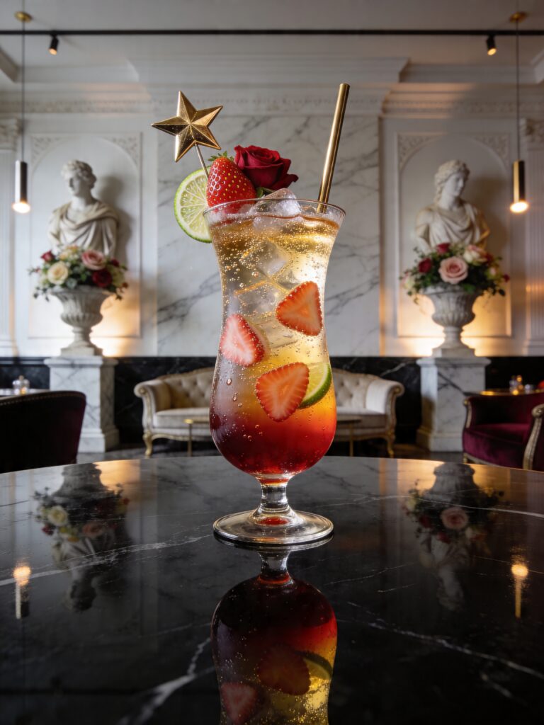 Essential elements include all of the specified ingredients: a golden star, a golden straw, freshly sliced strawberries, a touch of lime, and a vivid red rose. The hurricane glass is preferred, though alternatives may be embraced, provided they are aesthetically justified and of equal distinction.