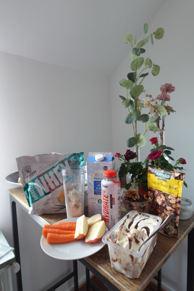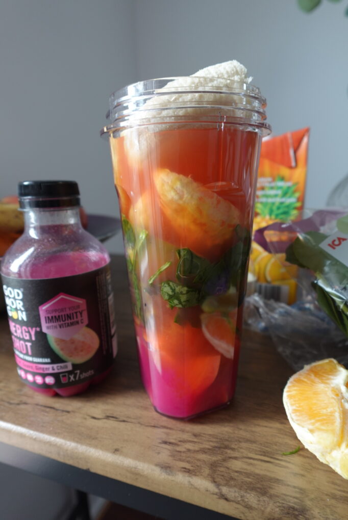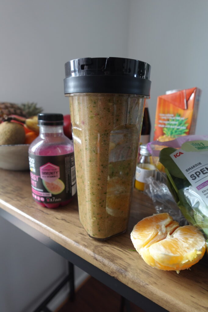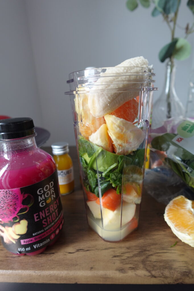 I’ve acquired myself a smoothie mixer and bought vegetables, spinace, fruits, shots and juices. I also add in EAA into the smoothies before workout.